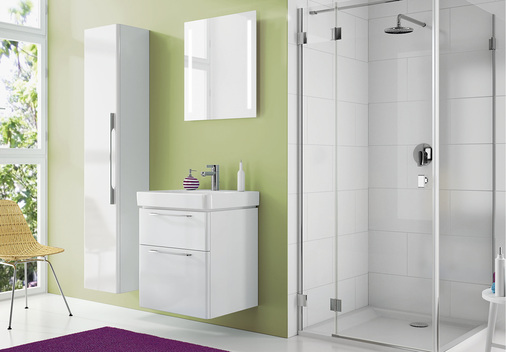 Ein Hochschrank mit integriertem Spiegel rundet das Möbelportfolio ab. Optional wird ein Handtuchhalter angeboten, der direkt an den Möbeln montiert werden kann. Zum Programm gehören weiter ein Ordnungssystem, ein energiesparendes LED-Beleuchtungsmodul für die Schränke sowie Magnethalter.