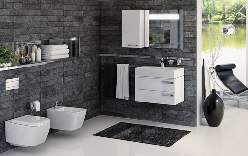 Keramikkörper: Waschtische 90, 70, 60, 50 cm, Aufsatzwaschtisch 60 cm mit glasierter Rückwand, Aufsatzwaschtisch ohne Hahnbank, Einbauwaschtisch, Unterbauwaschtisch, Kombination mit Wandtiefspülklosett und Wandbidet Mia mit verdeckter Befestigung, spülrandfreies WC, WC-Sitze mit und ohne Softclosing