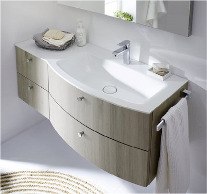 Wer maßgeschneiderte Einbausituationen wie ein passgenau unter die Dachschräge geschmiegtes Bad braucht, hat die Lösung in Form von zwei keramischen Waschtischen (rund und eckig), die bis zu einer Breite von 1410 mm vollständig maßflexibel gefertigt werden. Und dies in präzise gerundeter und rundum glasierter Qualität, sodass am fertigen Produkt keine unglasierten Flächen zu sehen sind. Auch Aufsatzbecken (Keramik und Mineralguss) in rund, eckig oder oval mit und ohne Armaturenbank sind lieferbar. Glaswaschtische gibt es in 26 Farbvarianten, jeweils in Matt und Hochglanz.