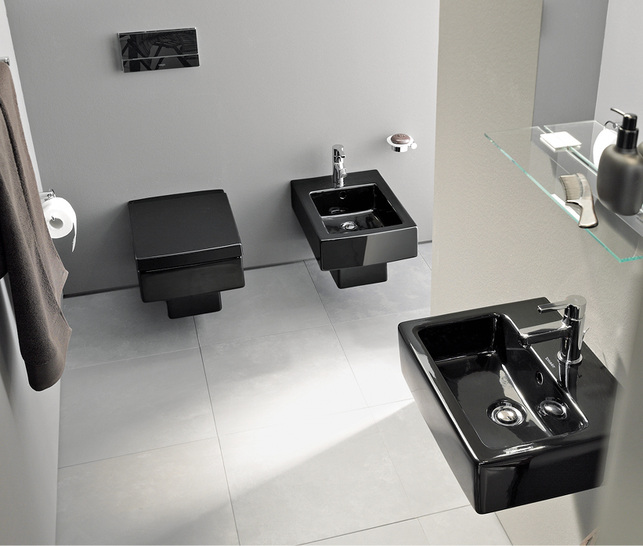 WC und Bidet – wandhängend oder als Standversion – komplet-tieren Vero in Form und Funktion. Das Design der Becken ist durch die rechteckige Grundform des Waschtischs geprägt und setzt sich nach unten hin in Form eines schmaleren Quaders fort. Bei der WC-Kombination nimmt auch der bündig aufgesetzte Spülkasten die klare, rechteckige Formgebung der Waschtische auf.