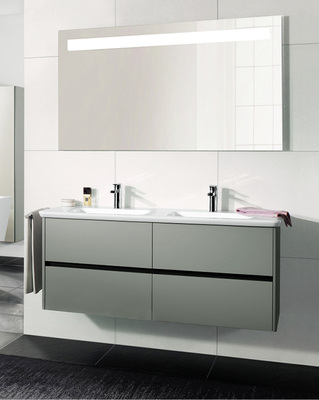 Badmöbel: Waschtischunterschränke (540 mm, 440 mm Höhe) mit flexibler Inneneinteilung, Konsole für WT 60 cm, Spiegel My View14+ mit Relingsystem und abschließbarem Fach und More To See 14, Rollhocker, Rollcontainer, Hochschränke