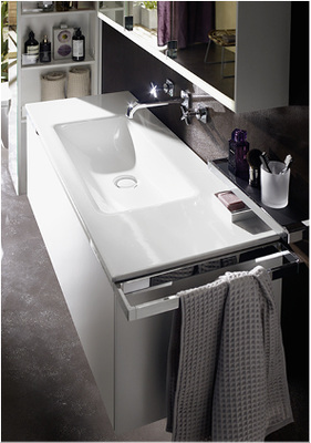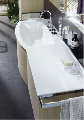 Innovativ überrascht die minimalistische Keramik mit 12 mm Kantenstärke beim Waschtisch, der in zwei Grundmodellen – einer geraden und einer sanft gewölbten Variante jeweils in linker und rechter Ausführung erhältlich ist. Der Waschtisch kann in Verbindung mit Sys30 und RC40 flexibel mit umlaufend glasierter Kante gefertigt werden. Auch das WC mit schmutzabweisender Oberfläche und optimiertem Soft-Close passt zum gehobenen Komfort-Anspruch von Yso. Die gerundete Waschtischeinheit fügt sich durch die tiefenreduzierte asymmetrische Ablagefläche auch in kleine Bäder ein. Bündig integrierte, verchromte Bänder umrahmen die Griffmulden und können als Handtuchhalter oder Wandablage eingesetzt werden.