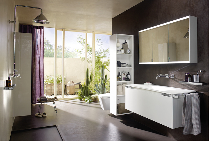 Badmöbel: Waschtischunterschränke mit Auszug inkl. Inneneinteilung und Handtuchhalter Chrom; Spiegelschränke mit LED-Beleuchtung, wahlweise mit Lichttemperatur-Steuerung, Leuchtspiegel mit LED-Beleuchtung, halbhoher Schrank, Hochschränke und Raumteiler
