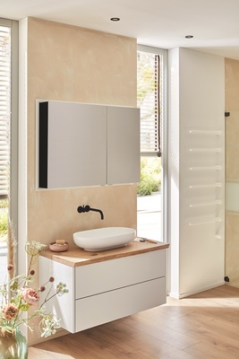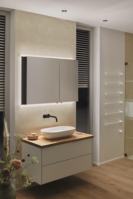 Der Spiegelschrank Modern-Line fügt sich als weiteres Element passend ein. Schwarz gestaltbare Seitenelemente sorgen hier für stimmige Akzente. Als Aufputzvariante mit dem Taly-Abdeckrahmen liefert der Ordnungshüter das passende Licht.