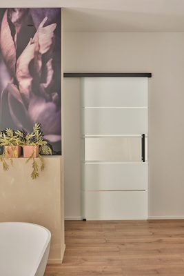 Verschiedenste Farbakzente und Motive lassen sich über das Produktportfolio hinweg harmonisch abstimmen. Die Glasdusche Omega Black Edition und das Schiebetürsystem Motion 1300 passen durch ihre mattschwarzen Beschläge hervorragend zusammen. Ein schwarzer Duschkopf und dunkle Armaturen ergänzen das Zusammenspiel. Mit dem Highlight der sich widerspiegelnden Siebdruckmotive in Mattweiß auf Dusche und Schiebetür bilden die Produkte ein einheitliches, stimmiges Gesamtbild im Badezimmer.