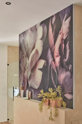 - Zahlreiche Gestaltungsmöglichkeiten wie tiefschwarze, seidenmatte Beschläge, Siebdruck in mattweiß auf dem Glas oder bunter UV-Digitaldruck auf den Wandgestaltungselementen