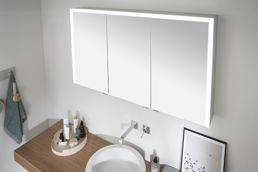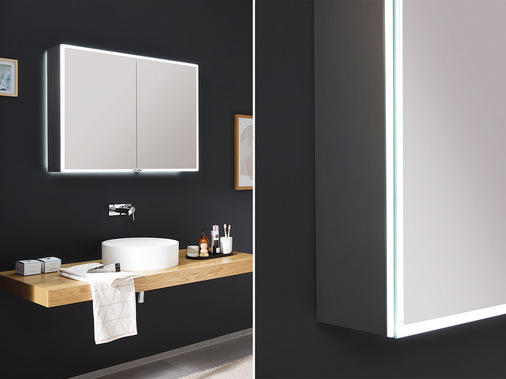 Die lückenlos umlaufende Beleuchtung hält sich hinter den Doppelspiegeltüren dezent im Hintergrund. Dennoch kann das Licht mit seiner ganzen Strahlkraft sanft durch die feine sandgestrahlte Umrahmung an den Spiegeltüren durchscheinen ohne zu blenden. So wird von einer fugenlos durchgehenden Spiegelfläche profitiert, die einfach zu reinigen ist, in Kombination mit einer optimalen Beleuchtung, dessen Helligkeit und Lichtfarbe stufenlos individuell einstellbar ist.