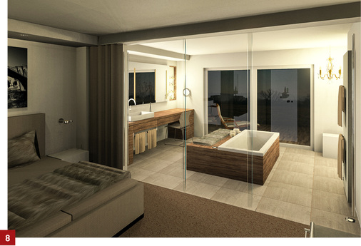 Der Wunsch nach großzügiger, lichtdurchfluteter Architektur, kombiniert mit flächeneffizientem Bauen, lässt Räume zusammenwachsen, denn jeder Quadratmeter kostet. So werden immer häufiger – vor allem bei Sanierungen/Umbauten – Master-Bad und Schlafzimmer vereint. Die trennende Wand wird eliminiert und so verliert das Badezimmer eine Objekt- und Installationswand ( Bild 8 ). Dieser Trend birgt jedoch einige Probleme, welche nicht außer Acht gelassen werden sollten: Wird zum Schlafen eine ideale Raumtemperatur zwischen 14 bis 18 °C empfohlen, liegt die gewünschte Badezimmertemperatur dagegen mindestens bei 24 °C. Zudem können bei Paaren – vor allem mit unterschiedlichen Tagesrhythmen – Schlafbeeinträchtigungen die Folge sein. Wenn ein Partner später zu Bett geht oder früher aufsteht, liegt der schon oder noch Schlafende ja sozusagen im Badezimmer, während der andere duscht, sich die Zähne putzt oder seine Notdurft verrichtet. Eine klimatische und akustische Trennung dieser beiden Bereiche ist also unverzichtbar. Glasabtrennung ist hier das Zaubermittel, wobei Ganzglasanlagen in beiden Punkten schwächer als Rahmenglasanlagen sind, besonders im Türbereich. (siehe Artikel SBZ 18/2010 „Zug in der Dusche und klamm im Bett?“) Als Fazit bleibt: Es fehlt im Bad eine Installationswand!