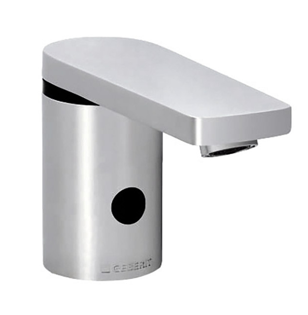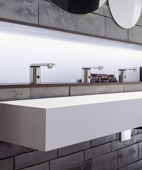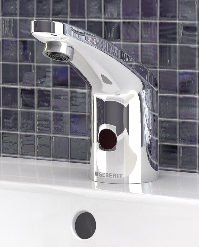 Für die Nutzung in öffentlichen sowie halböffentlichen Sanitärbereiche eignen sich insbesondere die Geberit Armaturen Typ 185/186: Sie sind berührungslos bedienbar und lösen den Wasserstrahl reaktionsschnell aus. Darüber hinaus zeichnen sie sich durch Langlebigkeit und Robustheit aus – ideal für den Gebrauch in öffentlichen Sanitärräumen. In puncto Nachhaltigkeit überzeugen sie ebenfalls: Bei Bedarf macht ein kleiner Generator in der Trinkwasserzuleitung die Armatur unabhängig von der Energieversorgung über das Stromnetz oder den Batteriebetrieb. Sobald der Waschtisch benutzt wird, treibt das fließende Wasser in der Zuleitung eine Turbine an, die Strom erzeugt und damit einen Akku lädt, der sicherstellt, dass die Funktionen der Armatur jederzeit einsatzbereit sind. So ist berührungsloses und hygienisch sicheres Händewäschen auch dort möglich, wo ein Netzanschluss nicht oder nur mit hohem Aufwand erfolgen kann. Der Generator lässt sich problemlos nachträglich einbauen, was noch mehr Sicherheit bei der Versorgung ermöglicht. Auch die Trinkwasserhygiene ist dank flexibel regulierbarer Intervallspülungen sichergestellt. Sowohl die Spüldauer als auch das Spülintervall kann hier eingestellt werden. Selbstverständlich sind beide Armaturen auch für Batterie- oder Netzbetrieb geeignet. Dank ihrer hochglanz-verchromten Oberflächen und der kompakten Bauweisen sind sie zudem besonders reinigungsfreundlich. Die Geberit Armaturen Typ 185/186 sind mit und ohne Temperaturwählgriff erhältlich.