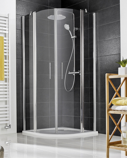 Funktional kommt die Runddusche Favorit Nova von HSK daher. Mit der Ecklösung bietet die Duschkabine Platz auf minimalem Raum: Das Bad erscheint optisch größer. Besonders praktisch: die Drehtürlösung. In einer Höhe von 195 cm lieferbar, hat diese Türvariante einen klaren Vorteil. Sie ermöglicht auf wenig Raum einen großzügigen Einstieg. Die integrierte Hebe-Senk-Technik der Drehtüren hebt die Glaselemente beim Öffnen leicht an und senkt diese sanft in die Schließposition zurück. Dies erleichtert die Handhabung und hat den Vorteil, dass die Türen nicht am Duschrand schleifen. Eine Magnetschließleiste sorgt zudem für ein zuverlässiges Schließen der Sicherheitsglas-Türen. Die dazu passenden, schlanken Favorit-Nova-Profile sind in Chromoptik, Alu silbermatt oder Weiß erhältlich. Der optimale Verstellbereich erleichtert darüber hinaus die Montage deutlich. Abgerundet wird das Design durch schlichte Stabgriffe.