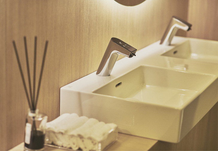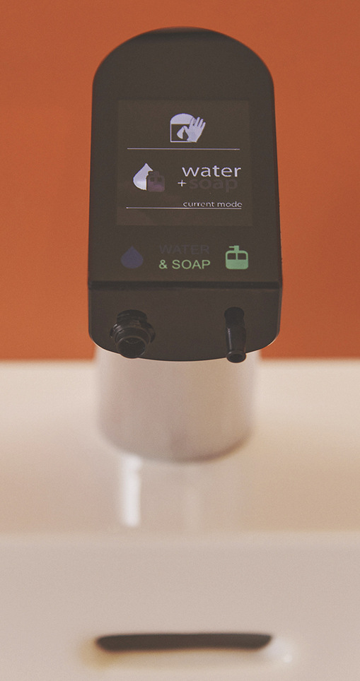 Berührungslose Armatur spendet sowohl Wasser als auch Seife