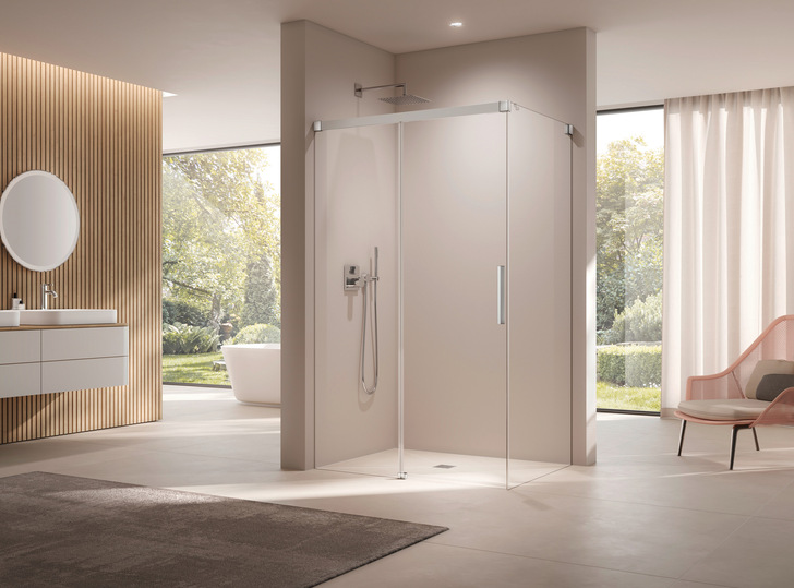 Die raumsparende Gleittür NICA ermöglicht einen bequemen und komfortablen Einstieg in die Duschkabine. Schwellenlos installiert ist sie bodeneben begehbar, erfüllt aber immer alle Anforderungen der Spritzwasserschutzprüfung nach DIN EN 14428. Die Gleittürsegmente sind zur leichten Reinigung nach innen schwenkbar.