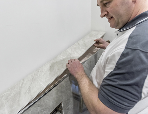 Splashboard heißt das neue Wandverkleidungssystem von Nordholm. Die Paneele bestehen aus PVC-Hohlkammerplatten. Laut Anbieter sind sie widerstandsfähig und robust. Das Material ist schwer entflammbar, beständig, hat eine hohe Festigkeit bei geringem Eigengewicht und hält einem Zug bis 250 kg stand. Nordholm bietet eine Kollektion unterschiedlicher Dekore an, die sich den Badezimmertrends anpassen. Bei einer Standardgröße von 10 mm Stärke, 1000 mm Breite und 2400 mm Höhe gibt es aktuell knapp 20 verschiedene Designs von schwarzem Granit über Kupfer Retrometallic bis Betonoptik Beige. Die individuell zuschneidbaren Nut-und-Feder-Platten sind laut Anbieter wasserdicht, fugenlos, hygienisch, wartungs- und schimmelfrei. Sie werden mit Silikonkleber auf den bestehenden Untergrund aufgebracht. Spezialwerkzeug ist nicht notwendig.