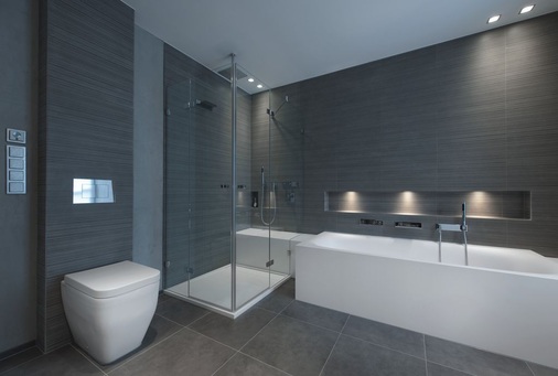Die Jury lobte das Bad der Ultramarin GmbH, da hier eine Versinnlichung der puristischen Innenarchitektur durch die besonderen Wandfliesen erreicht wurde. Ihre Struktur bringt eine sinnliche Note und schafft trotz minimalistischer Anmutung ein Wohlfühlambiente. Schön, dass es Bauherren gibt, bei denen das Budget mitspielt.