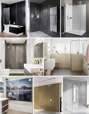 RenoVetro von HSK besteht aus Acryl. Die lichtbeständigen Designplatten besitzen eine glasähnliche Optik und sind in sieben Farben erhältlich. Das System RenoDeco besteht aus einem Aluminiumverbundstoff und kann in Stein-, Fliesen-, Holz-, Metall- und Betondekoren sowie unterschiedlichen Unifarben gewählt werden. Zu den Systemen gehören neben den Plattenprofilen darauf abgestimmte Montage-Kits. Ein rundes oder wahlweise gerades Profil bildet den Plattenabschluss.