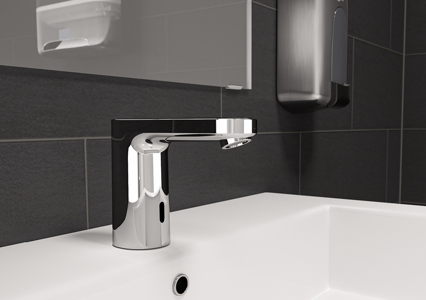 An und Aus ohne Berühren: Die neue Elektronikarmatur Vernis Blend der Marke hansgrohe garantiert durch die integrierte Sensortechnologie eine berührungslose und komfortable Bedienung, gerade dort, wo höchste Anforderungen an Hygiene, Komfort und Wasserverbrauch gestellt werden. Mit dem integrierten Schmutzfilter in den Verbindungsschläuchen und dem eingebauten Rückflussschutz ist die Elektronikarmatur eine sichere Option mit geringer Ausfallhäufigkeit.