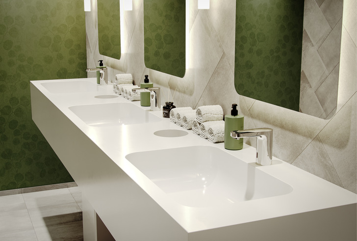 Durch die hochwertige Metalloberfläche und das Design mit reduzierten und glatten Kanten fügt sich Vernis Blend auch harmonisch in private Waschräume wie beispielsweise das Gäste-WC. Dank flexibler Einstellungen wie der Dauer des Wasserstrahls und der Temperatur sowie der Installationsmöglichkeit im Batterie- oder Netzbetrieb orientiert sich Vernis Blend Elektronik gänzlich an den Bedürfnissen der Nutzenden. Die automatisierte Armatur von hansgrohe verfügt über die Funktion der thermischen Desinfektion, die Verunreinigungen wie Viren oder Bakterien in den Rohren durch Temperaturen von bis zu 70°C heißem Wasser nachweislich zerstört. Somit eignet sich die Armatur auch für die Nutzung als Trinkwasserquelle an öffentlichen Waschplätzen.