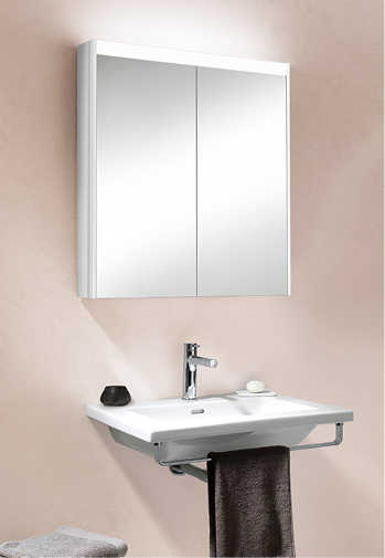 Mit O-line hat das Unternehmen W. Schneider den ersten Entwurf einer neuen Generation von Spiegelschränken vorgestellt. Für das Licht werden hochwertige LEDs eingesetzt, je nach Raumgröße reicht das laut Pressemitteilung sogar für die Raumausleuchtung aus. Bei der Lichtfarbe hat man die Wahl zwischen Warmweiß (3000 K) oder Kaltweiß (4000 K), je nach Präferenz. Als Option bietet sich zusätzlich eine untere, separat schaltbare Beleuchtung an. Der Korpus ist aus Aluminium; innen ist der Stauraum weiß gehalten und verfügt über stufenlos höhenverstellbare Glastablare. Die Spiegeltüre öffnet und schließt sich über Scharniere mit Dämpfer. Der neue Spiegelschrank ist in 16 Modellreihen und in diversen Breiten von 50 bis 150 cm erhältlich, für Aufputz- und Unterputz-Montage.