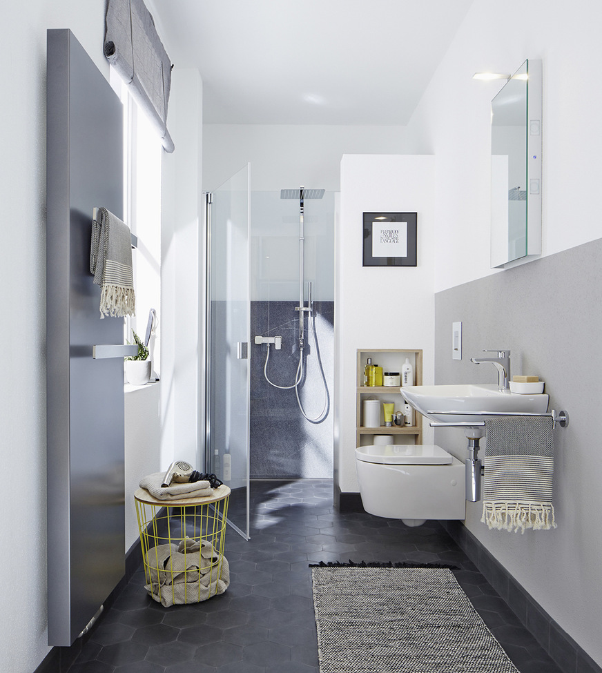 Die Gefahr, sich im Badezimmer farblich zu verplanen, ist bei der Verwendung von Grau auf ein Minimum reduziert. Selbst Fliesen können auch schon mal ohne Kenntnis der letztlich verwendeten Sanitärprodukte vor der Wand verlegt werden. Diese Flexibilität ist gerade für Wohnungsbaugesellschaften besonders interessant – werden die Sanitärprodukte in neuen Eigenheimen von der Bauherrin oder dem Bauherrn doch häufig erst im Nachgang beauftragt. Und die Zukunftssicherheit ist bei der Farbe Grau im Badezimmer, wie in der Vergangenheit schon beim Dauerbrenner Weiß, über einen langen Zeitraum gegeben.