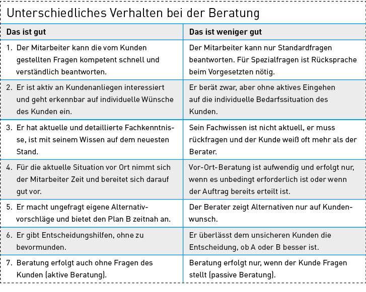 Aktiv beraten heißt, dass der Anbieter von sich aus Vorschläge einbringt und nicht wartet, bis der Kunde danach fragt. Bei der „passiven Beratung“ übernimmt der Kunde die Initiative im Gespräch und fragt nach Vorschlägen und Alternativen. Wer durch Schulungen einen aktuellen Wissensstand hat, tritt selbstsicher auf und beeindruckt Kunden. Mit der Beratung übernimmt der Mitarbeiter Verantwortung dafür, dass der Kunde eine optimale Entscheidung für sich trifft. Beratung wirkt objektiv, wenn man bei dem eigenen Vorschlag auch die Nachteile für den Kunden nennt. Beratung ist gelungen, wenn sich der Kunde am Gesprächsende für die Beratung bedankt.