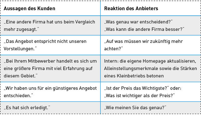 Manche Absagen enttäuschen aber besonders, weil man viel Zeit investiert hat. Die Angebotserstellung hat Stunden Zeit gekostet, es gab Vor-Ort-Termine, ein Alternativangebot und einige Telefonate. Der Auftrag wäre profitabel gewesen. Die Bemühungen um den Auftrag waren groß und dann sagt der Kunde mit dem lapidaren Satz „Es hat sich erledigt“ per E-Mail einfach ab, manche melden sich gar nicht. Eine schriftliche Auftragsabsage des Kunden rechtfertigt einen telefonischen Kontakt. Dadurch erhält der Anbieter Hinweise, was er zukünftig besser machen kann. Der Kundenkritik muss man sich stellen, ohne Widerstand und Verdruss. Ein Gespräch mit dem Entscheider ist wie Manöverkritik, man erfährt, nach welchen Motiven die Entscheidung des Kunden erfolgt ist. „Was hätten wir tun müssen, um den Auftrag zu erhalten?“, „Was schätzen Sie so sehr an der Firma, die den Auftrag erhalten hat?“, „Unter welcher Voraussetzung sind Sie bereit, uns wieder eine Anfrage zu schicken?“. Wie auch immer der Kunde antwortet, es geht nicht darum, sich zu rechtfertigen, sondern darum, den Hintergrund seiner Entscheidung zu erfahren. Zusätzlich kann man auch Wertschätzung vermitteln („Sie sind für uns ein wichtiger und angenehmer Kunde“), allerdings nicht mit der Gießkanne.
