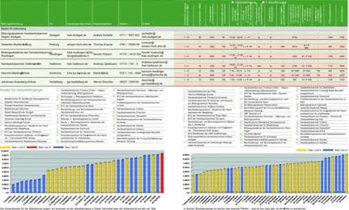 Die Lehrgänge, egal ob als „All-inclusive-Lehrgang“ (Vorbereitung auf die Prüfungsteile I bis IV) oder als technische Lehrgänge (Vorbereitung auf die Prüfungsteile I und II), kosten natürlich Geld. Das teuerste Pflaster für einen technischen Vollzeitlehrgang (Teil I und II) ist Koblenz. Berufsbegleitend muss man auch hier für einen solchen Lehrgang am tiefsten in die Tasche greifen. Wer sich mit einem Lehrgang auf die Teile I bis IV vorbereiten möchte, zahlt für einen Vollzeitlehrgang in Stade am meisten. Der Teilzeitlehrgang dafür ist in Aachen am teuersten. Die günstigste Teilzeitvorbereitung auf alle vier Teile der Meisterprüfung gibt es in Karlsruhe, die günstigste „I-IV-Vollzeitvorbereitung“ wird in Nürnberg angeboten. Die Kosten für erforderliche Lehrmittel sind nur bei einigen Offerten bereits in der Kursgebühr enthalten. Im überwiegenden Teil informieren die Bildungsträger die Interessenten darüber, welche zusätzlichen Gelder für die Anschaffung von Lehrmitteln nötig sind. Die Angaben reichen hier von „keine Zusatzkosten“ bis hin zu 1.550 Euro. Diese Unterschiede sind dadurch begründet, dass für die Teilnahme an einigen Lehrgängen nur der Besitz einiger Fachbücher vorausgesetzt wird. Bei anderen Lehrgängen ist nicht (nur) der Besitz von Büchern, sondern auch die Ausstattung mit einem Notebook gefordert.