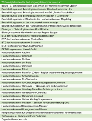 Das BTZ Rohr-Kloster der HWK Südthüringen und das BTZ der Handwerkskammer Schwerin vermitteln zehn Prozent des Lehrstoffes in Form von Lehrbriefen, die der Teilnehmer zu Hause in eigener Regie durcharbeitet. Bei der Handwerkskammer Cottbus werden 1,2 % des Unterrichtsstoffes auf diese Weise vermittelt.