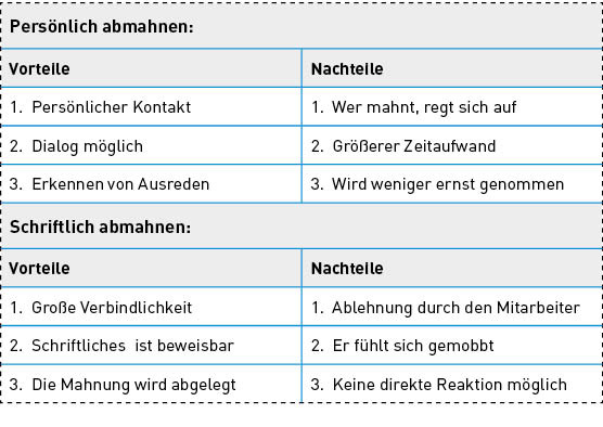 In der Abmahnung wird ein vertragswidriges Verhalten beanstandet. Eine Abmahnung ist die Vorbereitung für eine verhaltensbedingte Kündigung. Die Abmahnung hat eine Warnfunktion und muss sich auf einen oder mehrere konkrete Verstöße beziehen. Entgegen der weit verbreiteten Ansicht kann auch eine Abmahnung mündlich erfolgen. Die Schriftform ist nicht erforderlich, jedoch aus Beweisgründen sehr zu empfehlen. Die Warnfunktion wird entwertet, wenn bei erneuter Pflichtverletzung des Mitarbeiters wieder nur eine Kündigung angedroht, aber nicht umgesetzt wird.