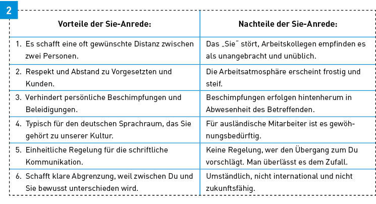 Viele Betriebe bieten der Belegschaft geschlossen das Du an. Dabei entstehen einige Fragen: Läuft die Zusammenarbeit besser, wenn jeder jeden duzt? Ist eine gewisse Distanz in schwierigen Situationen nicht besser? Sind beim Duzen die Erwartungen nicht größer als beim Sie? Wer das Du anbietet, verringert nur einseitig eine Distanz, das ist keine Aufforderung zum Schmusekurs.