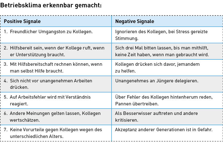 Jeder hat unabhängig von seiner Arbeitsaufgabe ganz individuelle Bedürfnisse. Oft prallen Meinungen und Interessen der Kollegen aufeinander und unterschiedliche Charakteren lassen sich nicht unter einen Hut bringen. Anfangs sind es kleinere Reibereien, die sich aufstauen und irgendwann eskalieren. Der Unterschied zwischen den Generationen ist ein Prüfstein für das Betriebsklima, denn es ist keinesfalls selbstverständlich, dass Jung und Alt gut miteinander zurechtkommen. Dem Ü-50-Jährigen fehlt oft das Verständnis für den U-30-Jährigen. Mit etwas mehr Toleranz zwischen den Kollegen kann man schon einiges erreichen. Akzeptanz und Verständnis untereinander sind die Basis für ein gutes Betriebsklima. In der Hektik des Alltags denkt man zu wenig daran. Ärger kann entstehen, wenn zwei Mitarbeiter bei der Ausführung ihrer Tätigkeit völlig unterschiedlicher Meinung sind. Man begibt sich dann auf die Ebene gegenseitiger Anschuldigungen, vor allem hintenherum. Rechthaberei in der Diskussion mit dem Kollegen ist immer klimaschädlich. Muss man denn immer seine eigene Meinung durchsetzen?