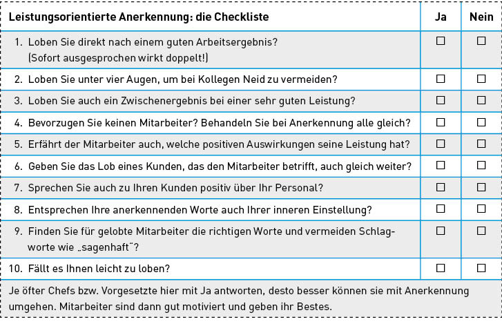 Der Betrieb ist kein Streichelzoo. Leistung gilt als selbstverständlich. Mitarbeiter werden zum Arbeiten angestellt und dafür bezahlt. Es besteht also keine sachliche Notwendigkeit, eine Leistung ausdrücklich anzuerkennen. So rechtfertigen viele ihr sparsames Loben: „Wenn ich zu viel lobe, zieht das Lob nicht mehr.“ Oder: „Meine Leute werden dafür bezahlt, dass sie ihre Arbeit gut machen, und keiner hat sich über mangelndes Lob beklagt.“ Oder: „Fängt man einmal mit Anerkennung an, kommt der Mitarbeiter noch auf die Idee, mehr Gehalt zu verlangen.“