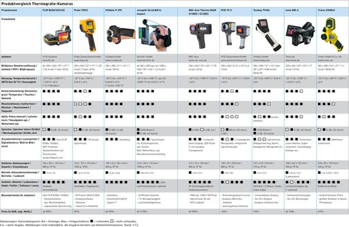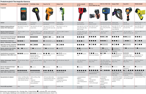Drei von den Anbietern angegebene Alleinstellungsmerkmale heben die Besonderheiten der Kamera hervor. Der Preis entspricht dem vom Anbieter angegebenen Verkaufspreis in Euro (zzgl. MwSt.) für eine komplette Thermografie-Kamera inklusive Standard-Zubehör.