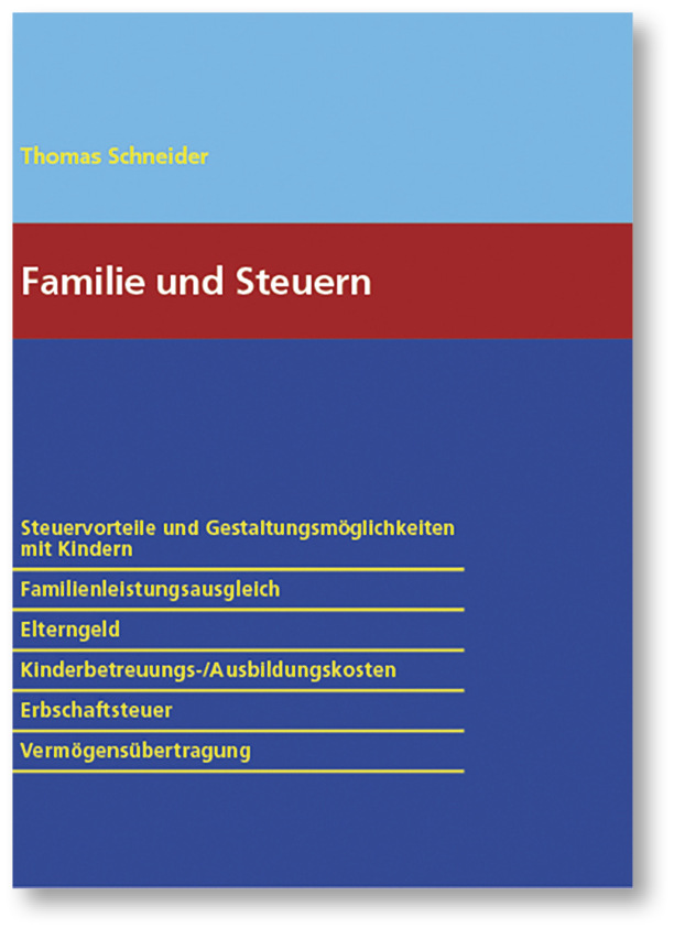 Unser SBZ-Autor Thomas Schneider erläutert in seinem neuen Buch die für Familien und ihre Kinder wichtigen steuerlichen Sachverhalte im Unternehmen. Themen sind: Steuervorteile und Gestaltungsmöglichkeiten mit Kindern, Familienleistungsausgleich, Elterngeld, Kinderbetreuungs-/Ausbildungskosten, Erbschaftssteuer, Vermögensübertragung. Der Ratgeber ist kartoniert und umfasst 152 Seiten. Er ist im HDS-Verlag erschienen und kostet 39,90 Euro.