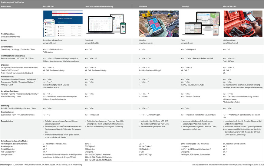 Hit Tracking (www.hit-tracking.com), PDS Geräte- und Werkzeugverwaltung (www.pds.de), Tool Connect (www.dewalt.de), ToolTrack (www.mycraftit.com); ohne Anspruch auf Vollständigkeit