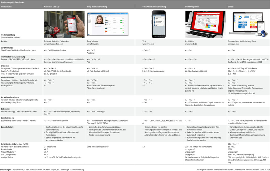 Alle Systeme versprechen, die Produktivität im Arbeitsablauf zu steigern, den Werkzeugschwund zu reduzieren und teilweise auch die Inventur zu erleichtern. Neben bekannten Werkzeugherstellern wie Bosch, Hilti, Milwaukee oder Würth gibt es auch Lösungen von Soft- oder Hardwareanbietern wie IdentPro, Timly Software und anderen. Das System UnTouch des Softwareherstellers Coeln Concept ist für Mitgliedsunternehmen des ZVSHK als ZVTool zu einem Vorzugspreis erhältlich. Alle Systeme nutzen die Popularität und Verbreitung von Smartphones und Tablets auf der Baustelle und die Möglichkeiten der Vernetzung über das mobile Internet.
