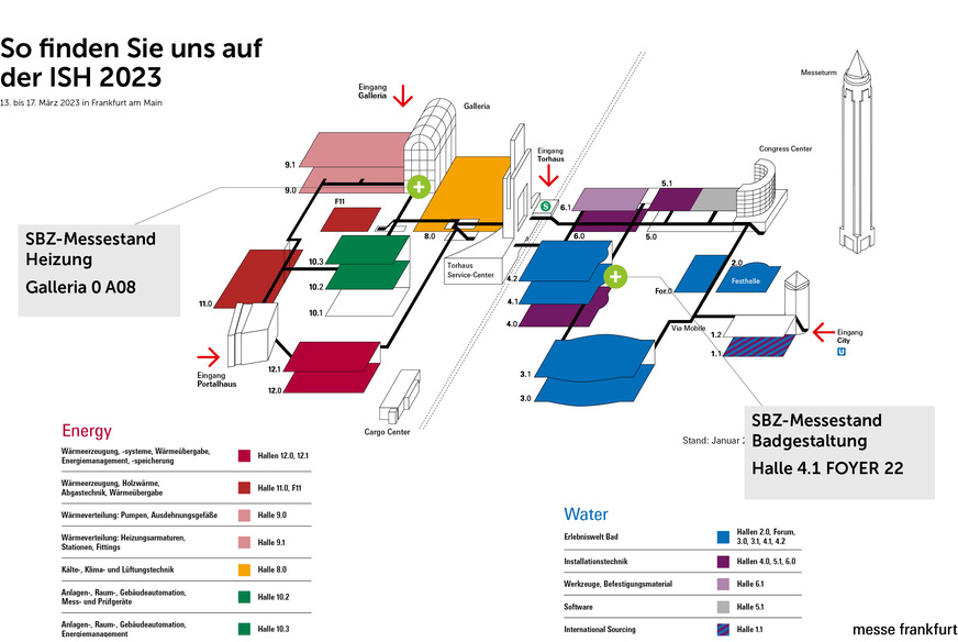 Die ISH vom 13. bis 17. März 2023 in der Messe Frankfurt steht unter dem Motto „Lösungen für eine nachhaltige Zukunft“. Ob Handwerk, Handel, Industrie, Planungsbüro oder Bau- und Wohnungswirtschaft sowie öffentliche Behörden und Versorger – Entscheider aus der SHK-Branche erwartet ein vielfältiges Rahmenprogramm. Für schnelle Orientierung sorgt erstmals die thematische Bündelung der Events in Form von Hotspots.