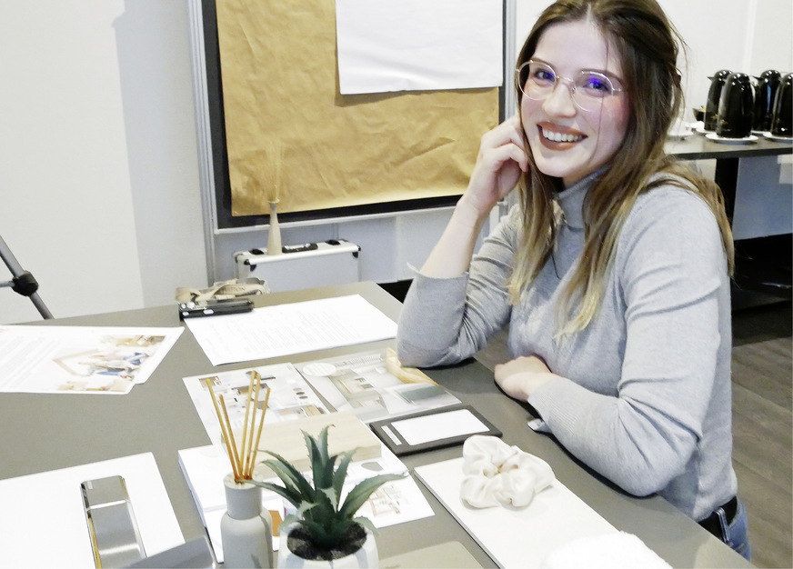 Deshalb war es an diesem Abschlusstag in den Präsentationen interessant zu erleben, wie die Kursteilnehmenden darauf eingingen. Da beeindruckte beispielsweise als Wandgestaltung eine Dünenlandschaft auf Fototapete, die sich bis in den Duschbereich ausdehnte. Der Grund: In der Prüfungsaufgabe sollte es um ein Paar mit vielen Freizeitaktivitäten gehen, das ein Faible für die Küste hat und die Sehnsucht danach in der weiter entfernten Eigentumswohnung wach halten möchte.