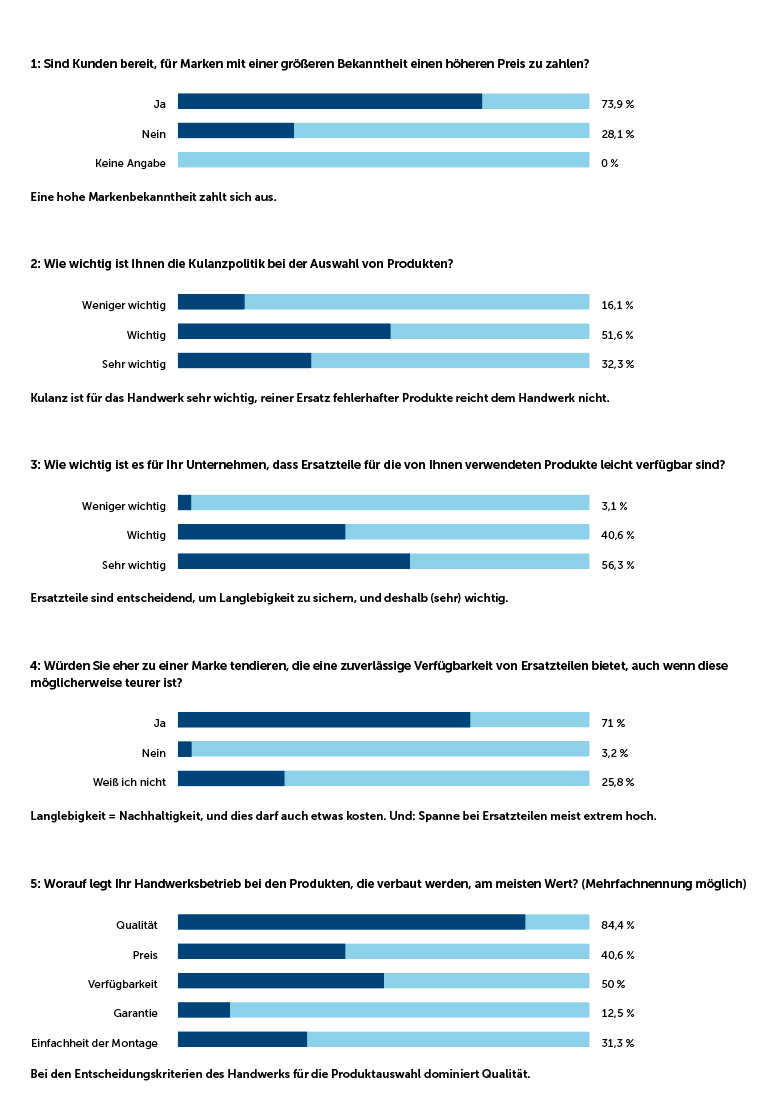 Beim Preis punkten die Handelsmarken. Gerade die Hersteller sehen den Preis als extrem wichtig an für die Entscheidung, was als nachvollziehbar angesehen wird. Letztendlich ist für das Handwerk aber der Preis nur sekundär, die Gesamtkosten, inklusive Einbau, sind entscheidender. Hier kann die Ausrichtung auf einen Hersteller mit entsprechenden Schulungen durch den Hersteller für die optimale Verarbeitung einen enormen Vorteil für das Handwerk darstellen. Und wie zu Beginn dargestellt, zahlt der Kunde teilweise auch mehr für eine bekannte, renommierte Herstellermarke.