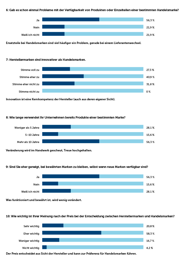 Das Handwerk präferiert bisher aus der Risikoaversion heraus deutlich die Herstellermarke (62,5 %), ist aber in vielen Fällen (28,1 %) flexibel, häufig auch aus dem wirtschaftlichen Druck heraus. Und es gilt, neben der allgemeinen Abschätzung der Risiken auch die verschiedenen Kundensegmente differenziert zu betrachten: