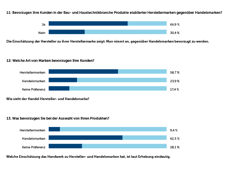Wichtig ist für das Handwerk zu wissen, dass der Handel seine Handelsmarke stark präferiert. Schließlich erhält er dort höhere Margen und entgeht dem Preiswettbewerb. Interessant ist, dass sowohl Hersteller ihre Herstellermarke überschätzen (69 % versus 62 %) als auch der Handel seine Handelsmarke (23,9 % zu 9,4 %), Letzterer sogar noch deutlicher.