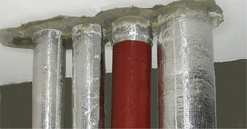 Bild 3 zeigt die typische Mischinstallation im Fallstrang, die mit Brandschutzverbindern und dem Spaltverschluss im Deckenbereich abgeschottet wird. Dagegen können in der Kellerverteilung einfache Maßnahmen entsprechend den Erleichterungen der MLAR angewendet werden. In Bild 1 wird eine Platte mit aufschäumendem Baustoff um das Gussrohr in den Durchbrüchen gewickelt. Bei einigen Produkten werden damit gleichzeitig die Anforderungen an den Brandschutz und die Schallentkopplung erfüllt. Vorreiter für diese Technik ist die von der UBA Tec (Berlin) entwickelte UBA-Platte (4 mm).