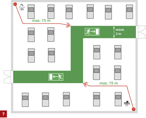 Im Regelfall ist die maximale Rettungsweglänge – bei einer lichten Höhe bis zu 5 m – auf 35 m beschränkt. Wenn eine automatische Brandmeldeanlage (Internalarm) oder selbsttätige Feuerlöschanlage und Handauslösung der Alarmierungseinrichtungen vorhanden sind, erhöht sich die maximale Rettungsweglänge – bei einer lichten Raumhöhe bis zu 5 m – auf 50 m. Mit zunehmender lichter Raumhöhe erhöhen sich die maximalen Rettungsweglängen auf maximal 50 m bzw. 70 m ( Bild 5 und 6 ).