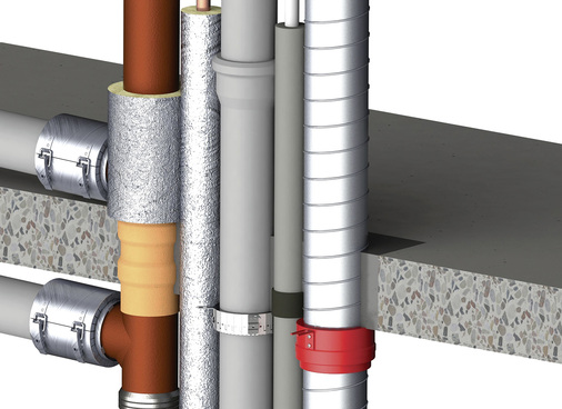 Vorteil einer solchen Abschottung ist die einfache Anwendung, indem an jeder Deckendurchführung eine Brandschutzmanschette montiert wird ( Bild 2 ). Die wesentlichen Bauteile sind die Brandschutzmanschette für den Verschluss des Rohres, der Schallschutz (meist PE-Schaumfolie), der Deckenverguss und als ein wesentliches Bauteil, was oft nicht beachtet wird, die Befestigungsschelle. Der Deckenverguss mit der PE-Schaumfolie ist verantwortlich für die Rauchgasdichtheit. Die Befestigungsschelle (oberhalb des Brandraumes) muss dafür sorgen, dass das Rohr im Brandfall nicht abrutschen kann und den Rohrverschluss in der Brandschutzmanschette zerstört. Im Brandfall wird das Rohr meist auch oberhalb der Decke weich. Das Brandschutzmaterial in der Brandschutzmanschette dehnt sich durch die Temperatureinwirkung aus und quetscht das Rohr zusammen. Daher ist in den Verwendbarkeitsnachweisen eine Befestigung bindend vorgeschrieben. Lose Schallschutzschellen können das nicht erfüllen. Eine Brandschutzmanschette muss in jeder Deckendurchführung montiert werden. Es gibt unterschiedliche Einbaumethoden, die jeweils für die Dimension, Bauart, Rohrtyp und -material aus dem Verwendbarkeitsnachweis abgeleitet werden müssen. Die Brandschutzmanschette ist immer am Bauteil Decke so zu befestigen, dass über die gesamte Feuerwiderstandszeit keine Ablösung eintritt. Dass die dafür verwendeten Dübel oder Schraubanker für den jeweiligen Untergrund geeignet sein müssen, versteht sich von selbst.