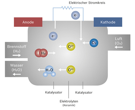 An der Anode wird der aus dem Erdgas stammende Wasserstoff (H2) katalytisch gespalten: in positiv geladene Wasserstoffkerne (Protonen) und negativ geladene Elektronen. Der Vorgang erfolgt katalytisch, weil Wasserstoff an sich stark gebunden ist und die Spaltung viel Energie erfordern würde. Die Anode ist deshalb mit Nickel beschichtet, das als Katalysator fungiert. Der Katalysator ermöglicht eine kontrollierte kontinuierliche Umwandlung von Wasserstoff und Sauerstoff in Ionen, indem er die erforderliche Reaktionsenergie absenkt. An der Kathode aus Keramik wird der Luftsauerstoff katalytisch aufgespalten. Die negativ geladenen Sauerstoff-Ionen wandern anschließend durch den Elektrolyten (ebenfalls Keramik), um dann an der Anode mit den Wasserstoffkernen zu reagieren. Als Resultat der Reaktionen an der Anode entstehen Strom und harmloser Wasserdampf als Nebenprodukt.