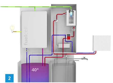 Eine Systemregelung sichert das Zusammenspiel der Komponenten. Die Aufgaben sind dabei klar verteilt: Die Brennstoffzelle arbeitet rund um die Uhr und speichert die entstehende Wärme im Pufferspeicher. Diese wird für die Raumheizung und Warmwasserbereitung genutzt. Das Gas-Brennwert-Hybridgerät Cerapur Solar heizt über ein integriertes Mischventil nur bei Bedarfsspitzen nach – wenn beispielsweise kurzfristig eine größere Menge warmes Wasser benötigt wird. So kann die Energie im Pufferspeicher optimal genutzt werden. Im Gegensatz zu Tank-in-Tank- und Frischwasser-Systemen wird ein Nachladen des Pufferspeichers durch das Gas-Brennwertgerät vermieden, was zu der Effizienzsteigerung beiträgt.