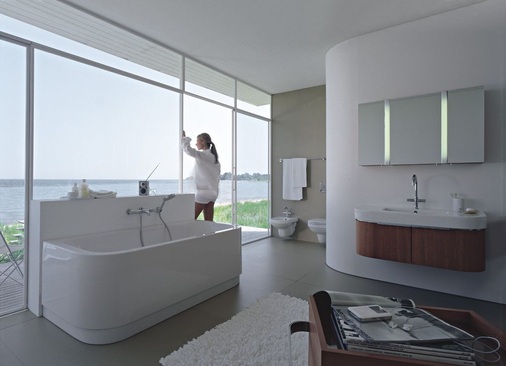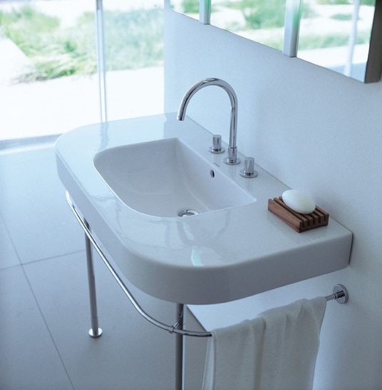 Das charakteristische D prägt die Form, die klassisch-archaische Linienführung zieht sich durch die komplette Badserie. Die große Vielfalt an Waschplatzlösungen spielen eine tragende Rolle im Happy D.-Programm. Es gibt sie wahlweise als simple Konsolen oder in Kombination mit ausziehbaren Unterbauten sowie Unterschränken mit Türen oder Schubkästen und schlichter Chromgriffleiste.
