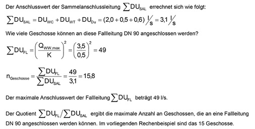 In Wohnhäusern können gemäß DIN 1986-100, Tab. 7 (Bild 6) die Sammelanschlussleitungen ebenfalls mit DN 90 dimensioniert werden. Bedingung ist, dass die Ablaufleistung aller Sanitärobjekte 13 l/s (DU) nicht überschreitet und dass nicht mehr als zwei WCs angeschlossen sind.