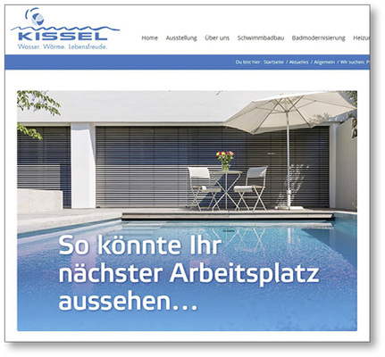 Aktuell sucht Kissel nach demselben Prinzip einen Heizungsbaumeister oder Heizungsbautechniker als Abteilungsleiter. Er setzt auf Onlineanzeigen in großen Portalen, die auf seiner Bewerbungsseite landen – dort steht auch das Video. Kissel sagt zur aktuellen Suche: „Es ist bestimmt nicht ganz einfach, jemanden zu finden. Aber das Schwierigste ist, eine oder einen zu finden, der wirklich passt.“ Und da hat Kissel bisher mit dem Video gute Erfahrungen gemacht. Er hat das Thema Vorstellungsgespräch per Video einfach umgedreht – er stellt sich den Kandidaten vor: „Das war recht formlos – wir haben uns einfach so gegeben, wie wir sind.“ Das Besondere am Unternehmen Kissel und der Hintergrund: Der Handwerksbetrieb hat sich auf die Schnittstelle zwischen hochwertigem Schwimmbadbau und innovativen Heizungsanlagen spezialisiert. Weil das kaum jemand „ad hoc“ beherrschen kann, muss ein Bewerber auch bereit sein, sich auf eine Horizonterweiterung einzulassen.