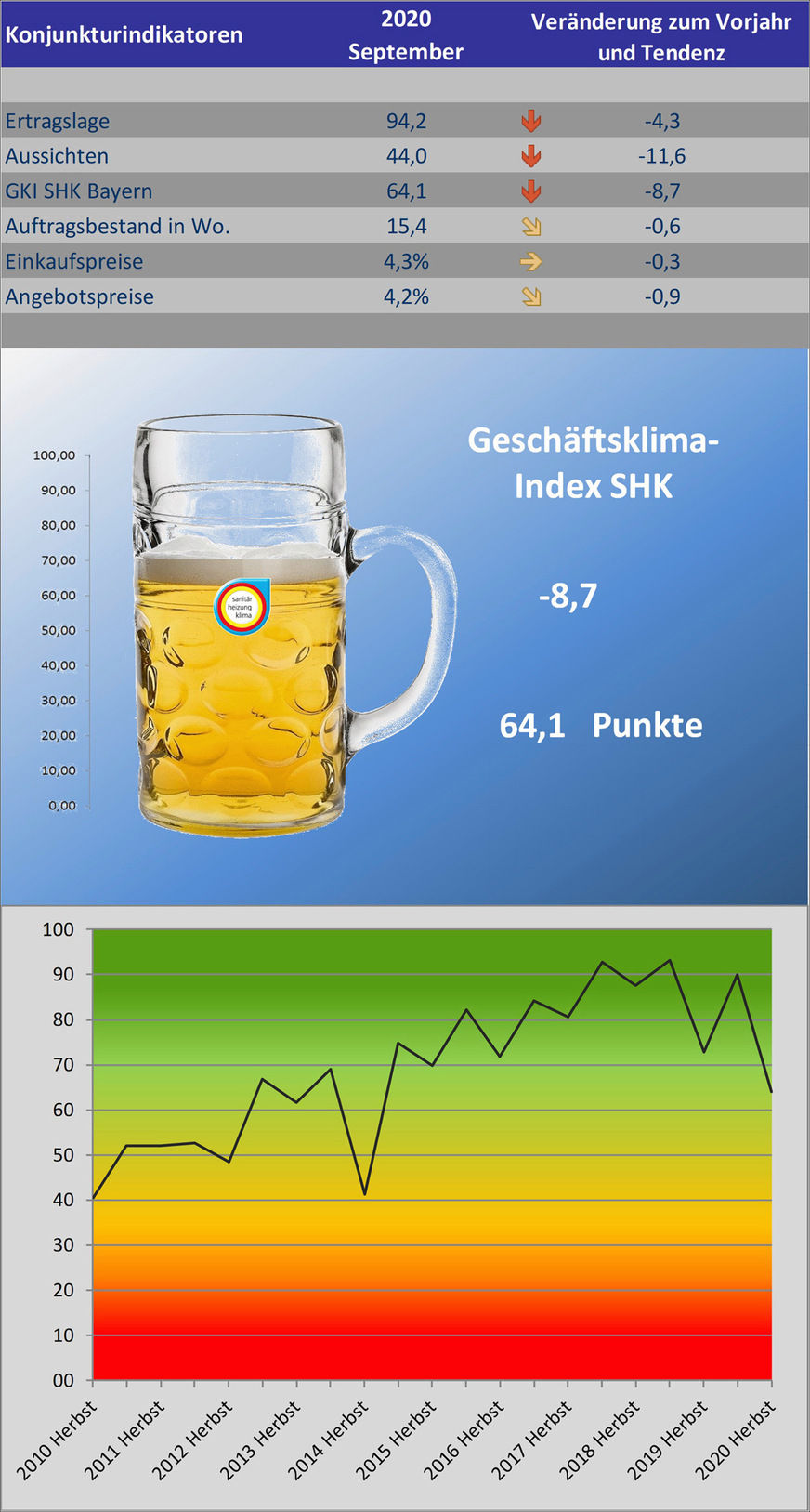 Der SHK-Geschäftsklimaindex für die bayerische SHK-Branche wird vom Fachverband SHK Bayern basierend auf der eigenen Konjunkturumfrage alle sechs Monate ermittelt. Der aktuelle Wert fiel im September 2020 um ca. 8 Punkte gegenüber seinem Stand vom Vorjahr auf insgesamt rund 64 Punkte. Der Stand des Index im Herbst wird immer mit seinem Stand im Herbst des Vorjahres verglichen. Somit werden die saisonalen Schwankungen aufgefangen.