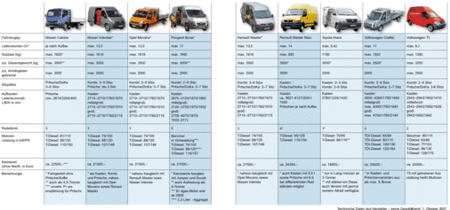 Vor allem die Euro4-Tauglichkeit der Dieselmotoren hat die Marken-Anbieter weit vor Beginn des Modelljahres 2007 zu erheblichen Weiterentwicklungen animiert. Dabei konnte es bei einigen Transportern nicht allein bei Modifizierungen unter der Motorhaube bleiben. Vielmehr galt es bei etlichen Modellen, die Baureihe in den Fahrwerksabstimmungen und der Steifigkeit der Zelle auf einen zeitgemäßen Stand der Technik zu bringen – das Finish einer aufgehübschten Front war da allenfalls äußeres Zeichen tiefgreifender Ingenieurleistungen. Einzelne Marken können diese Anstrengungen in ganzer Summe kaum mehr allein bewerkstelligen. Kooperationen kennzeichnen deshalb diesen Markt, um die beträchtlichen Investitionen zumindest in Teilbereichen mit Mitbewerbern zu teilen. Sind es bei den einen nur die Motoren, so kommen andere mit nahezu gleichen Karosserien in den Handel – als Beispiele sind hier die nahezu identischen Drillinge Nissan Interstar, Opel Movano und Renault Master zu nennen. Auch die aktuelle Generation des Fiat Ducato ist (bis auf ein Diesel-Aggregat) weitgehend identisch mit den Modellen Citroën Jumper und Peugeot Boxer. Die Italiener legten stets Wert auf leistungsfähige Neuerungen in der Motorisierung. Hierzu gibt es auch eine enge Zusammenarbeit mit Iveco – und selbst Konkurrent Renault wurde in der Vergangenheit für den Mascott mit einem Triebwerk bedient. Apropos Mascott: Diesen Transporter hatte Renault zunächst umbenannt in Master Maxi, dann für ein Jahr vom Markt genommen und jetzt im Herbst 2007 – nach Überarbeitungen an Motoren und Fahrwerk – wieder im Angebot. Zurück zu Gemeinsamkeiten: Mercedes und VW bieten mit Sprinter und Crafter wiederum Transporter-Zwillinge, deren Frontpartie und Motorenangebot zwar unterschiedlich sind, sonst aber im Aufbau und Variantenreichtum einschließlich Cockpit gleiche Komponenten verwenden. Das Angebot schadstoffarmer Erdgas-Versionen wird momentan durch Iveco (siehe separater Fahrbericht) und Ford repräsentiert, andere Marken stehen in der Entwicklungsarbeit. Deshalb gilt noch, dass in der Transporterklasse durchweg Diesel-Aggregate gefahren werden – seit Oktober 2006 Euro4-konform. Geht es um einen möglichst hohen Wiederverkaufswert, dann sollte man nicht nur auf eine strapazierfähige Frachtraumauskleidung achten, sondern die Schadstoffklasse Euro4 als Entscheidungskriterium mit hinzuziehen. Beim verlockenden Preisangebot eines Ladenhüters, Jahreswagens oder Leasing-Rückläufers gilt es daher das Für und Wider abzuwägen, denn – von Umwelt-Aspekten abgesehen – wird ein solches Euro3-Schnäppchen bald nicht mehr zeitgemäß sein.
